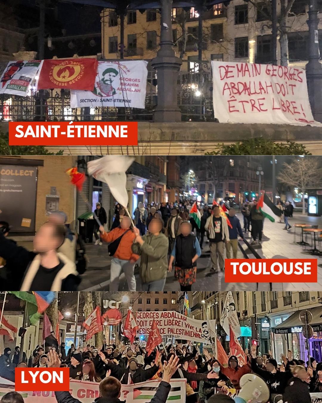 N° 914 26/02/2025 Après que la Cour d'appel de Paris ai décidé de reporter, une nouvelle fois, au 19 juin sa décision sur la libération de G. I. Abdallah, le combat continue. Malgré l'interdiction de manifester à Paris1 sous des pretextes fallacieux, y compris en s'appuyant sur l'attaque fasciste d'une réunion de jeunes lors d'une projection cinématographique antifasciste le dimanche 16 février dans les locaux de l’ACTIT (association culturelle des travailleurs immigrés turcs) à Paris, dans plus de 40 villes des manifestations et rassemblements ont exprimé le soutien à la libération de G. I. Abdallah.